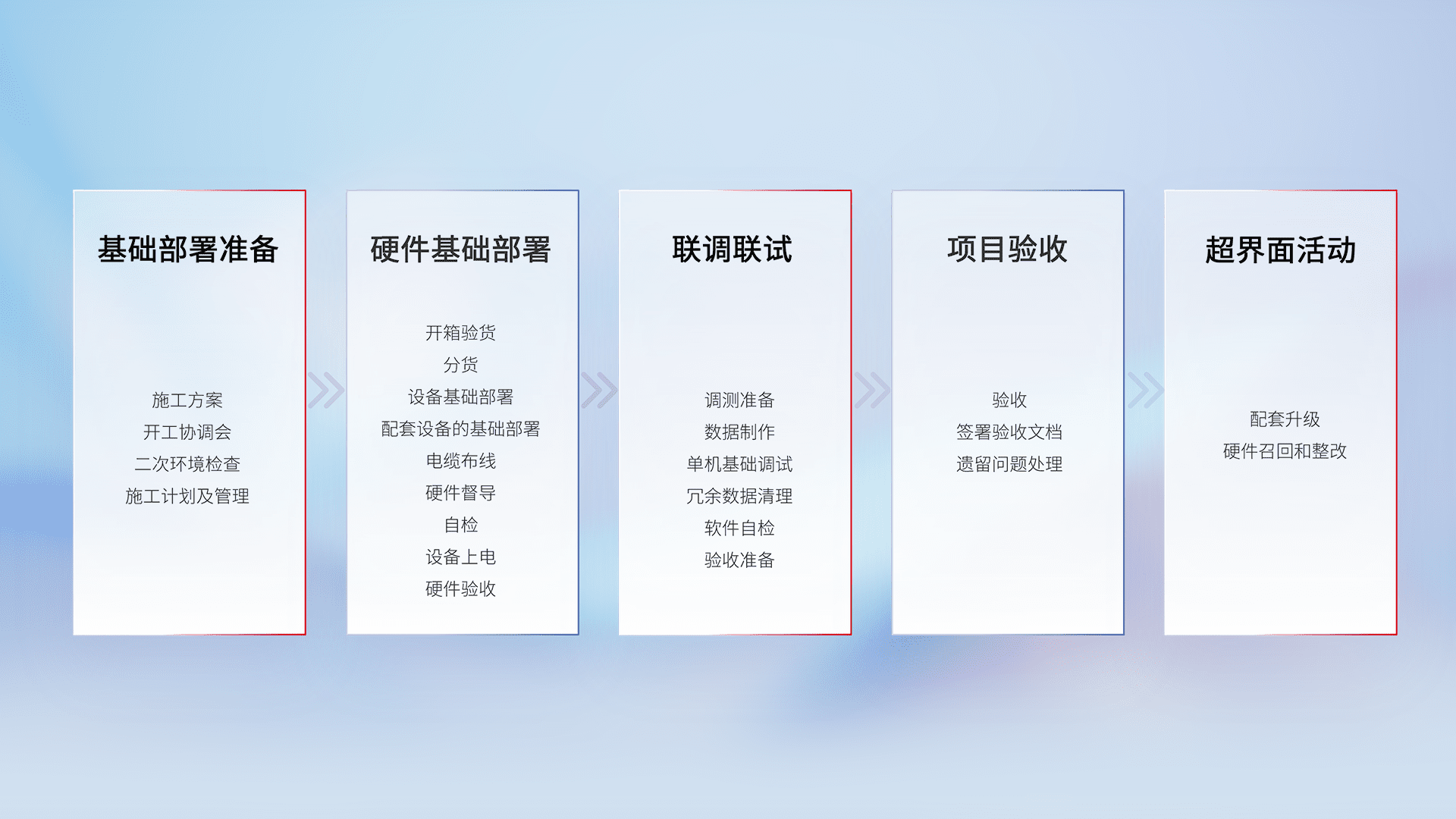 从基础部署准备、、、、硬件基础部署、、、联调联试、、、、项目验收、、越界面活动的全过程可追溯,,保证施工质量和进度。。。。